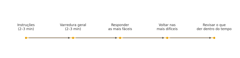 - Calcular aproximadamente quanto tempo por questão (por exemplo, 60 minutos para 30 questões ≈ 2 minutos por pergunta);